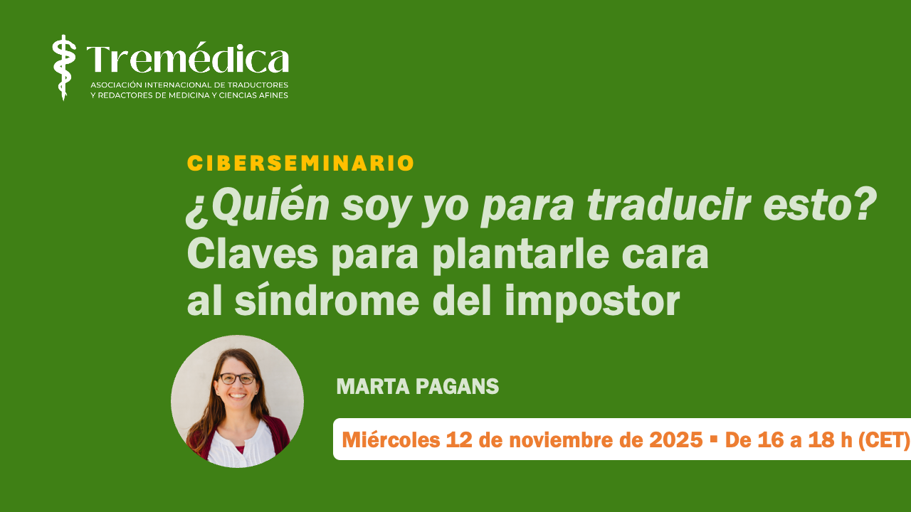 Ponente: Marta Pagans se licenció en Traducción en la Universidad Autónoma de Barcelona en el año 2000 y lleva 25 años dedicada a esta profesión. Empezó como traductora audiovisual (por lo que llegó a “ganar” un Óscar) y hoy en día se dedica ante todo a la traducción publicitaria o transcreación. Asimismo, imparte talleres y charlas y ayuda a colegas a organizarse mejor, superar el perfeccionismo y el miedo a la visibilidad. Aunque siempre ha recibido críticas muy buenas (o incluso excelentes) por su labor, de vez en cuando sigue preguntándose: “¿Quién soy yo para traducir esto?”. Por suerte, con los años ha descubierto técnicas que la ayudan a no dejarse paralizar por las dudas y evitar caer en el perfeccionismo y la procrastinación. Unas técnicas que está impaciente por compartir con los socios y socias de Tremédica.